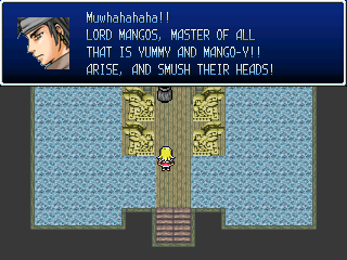 Also, I'm just now noticing a weird, possibly unintentional recurring pattern in this game -- wherever those Aztec-esque statues (shown throughout the Mangos Temple screenshots) show up, there's going to be some weird super-advanced technology of some sort involved. First there was the crystal back at Wafterville that fell from the sky and was somehow keeping ghosts from passing on, and now there's more here and the top floor's set happens to be a functional teleportation device. I think they may have been around in the Lava Kuarudo cave, too, and there was an airship there. I wonder who the Mysterious Space Aztecs (...that are never really mentioned or alluded to in this game, just in this oddball "conspiracy theory" about it that popped into my head a decade after the fact) really are/were? Maybe an idea to keep around in the back of my mind for future stuff....