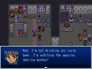 There's an odd sort of background-events plot going on in this game that up to this point I've forgotten to mention. Basically... back in some of the previous towns, there were several color-coded gangs -- one red, one blue, one green. The red and blue gangs got forced out of their towns by the green guys (the Yuckows) moving in, so they've headed off across the country following basically the same path that Enduo and company have taken. You can find random members of both gangs in various places leading up to this point, but it seems Nalles Geso is where they decided to settle down.